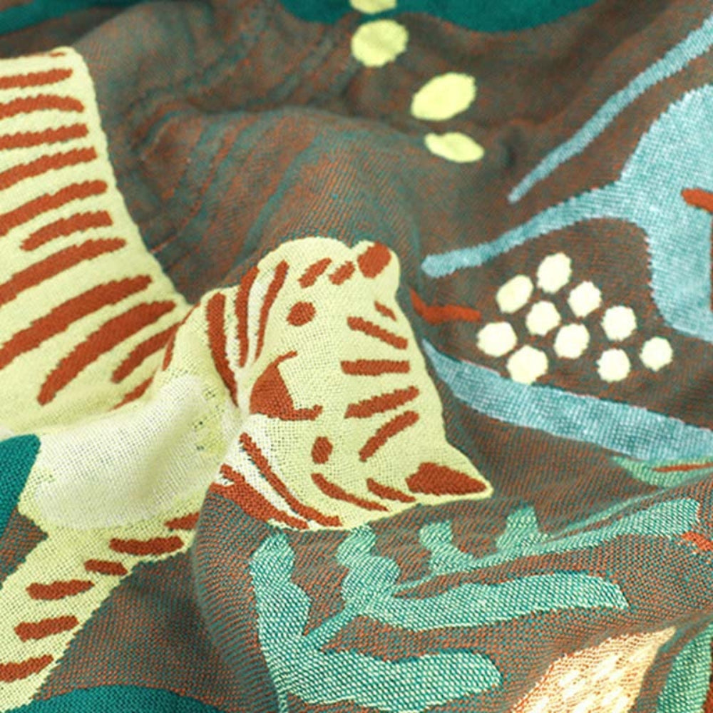 Transform your living space with our Tiger's Lair Reversible Blanket. Featuring a reversible pattern and tassel trim, this cotton gauze blanket is crafted with reactive printing and jacquard technology for durability and a vibrant design.